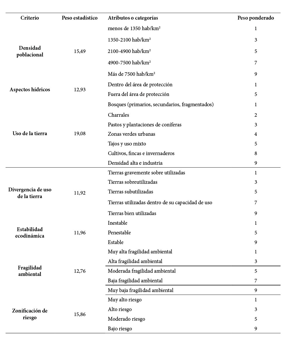 Después de emplear el método de jerarquías analíticas de Saaty (2005) se le aplicó sobre este peso otro peso por cada atributo de cada criterio o indicador. Para este estudio los valores van desde 1 hasta 9 (Cuadro 5), en donde los números menores requieren de alta intervención y los mayores de menor intervención.