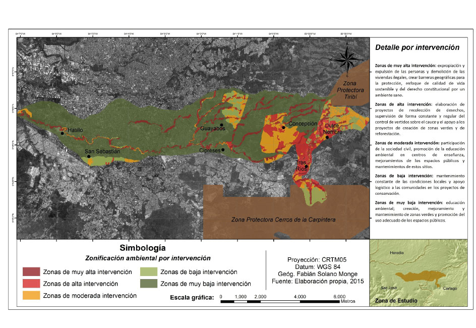 Se elaboró la zonificación ambiental por nivel de intervención, ya que la zona se ubica sobre el área urbana más grande de Costa Rica, por lo que la gestión y las restricciones de uso de la tierra y del suelo varían significativamente respecto a un área rural. Es importante rescatar que el territorio se debe fortalecer y se deben promover las oportunidades tanto socioeconómicas como ambientales de la zona. Con diferentes niveles de intervención, el CBIMA, como unidad ejecutora, puede crear una serie de políticas, planes y proyectos para el manejo acertado del área según las condiciones locales imperantes desarrolladas en la discusión.
