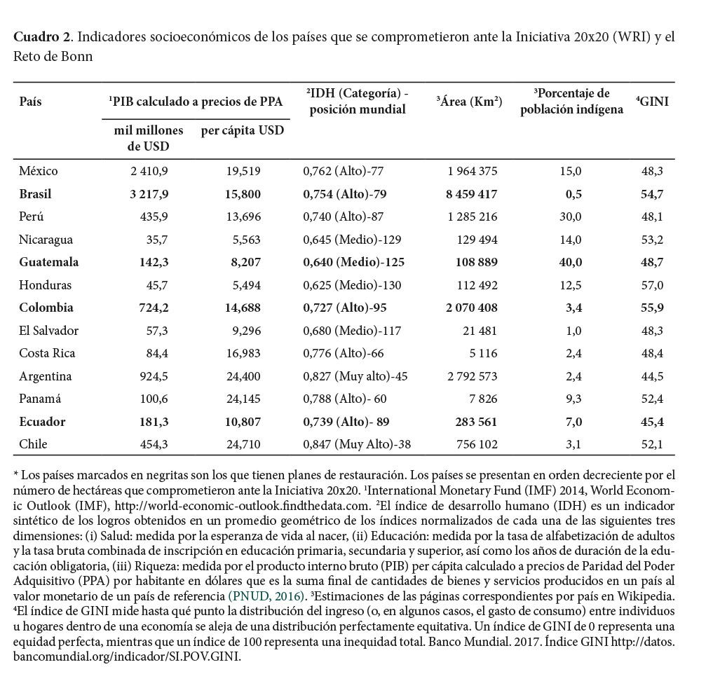 Los países que cuentan con un plan nacional de restauración muestran una amplia variación de condiciones sociales y económicas (Cuadro 2). Basándose en el producto interno bruto (PIB), las economías de los países varían en 3 076 mil millones de dólares. Brasil es el que tiene la economía de mayor tamaño, con casi 3 218 mil millones de dólares, le siguen Colombia, Ecuador y Guatemala (142 mil millones de dólares). En términos del producto interno bruto per cápita, Brasil sigue teniendo la economía más fuerte y Guatemala la más débil. En lo que se refiere al porcentaje de población indígena, la variabilidad también es enorme (0,5 - 40%), Brasil cuenta con el menor porcentaje y Guatemala con el mayor. Sin embargo, el índice de desarrollo humano (IDH) no presenta la misma gran variabilidad, ya que varía de medio a alto (entre 0,640 - 0,754) entre los países, y una vez más, el extremo superior corresponde a Brasil y el inferior a Guatemala. También en términos de desigualdad social (índice GINI) la variabilidad es menos marcada (44,5 - 54,7). Contradictoriamente, los dos países más ricos son los que presentan mayor desigualdad: Colombia en primer lugar, seguida por Brasil. En síntesis, Brasil es el país con mayor área, con la economía más fuerte y con mayor renta per cápita; sin embargo, es el segundo con mayor desigualdad social, y con el menor porcentaje de población indígena. En contraste, Guatemala tiene la menor área, menor PIB, PIB per cápita e índice de desarrollo humano y el mayor porcentaje de población indígena.