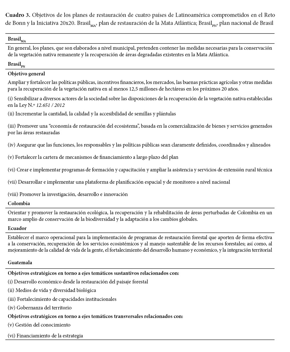 The Aichi 15 goal of the Convention on Biological Diversity, the Bonn Challenge, and the Initiative 20x20 are initiatives aimed at fostering restoration in Latin America; however, they are efforts that do not specify restoration processes. In this study, the countries having a restoration plan in Latin America were identified to analyze later the scope of the plans. The countries with restoration plans were Brazil, Colombia, Ecuador and Guatemala. The analysis showed that their objectives and restoration approaches coincide. It is outlined the consideration of setting objectives for recovering ecosystemic services in a sustainable way, as well as the adoption of long term and landscape-scale restauration approaches. The assistance of ecological succession is considered as a cost-effective way for restoration. Social participation is important for the construction and operation of initiatives, and a legal framework associated with the plans already exists. However, it is necessary for the philosophical framework of the plans to be strengthened, for socio-economic criteria and those of success to be included to the prioritization of areas, and for the ascending approaches to be developed in the restoration processes that benefit their financing. Protocols for monitoring biophysical and socioeconomic aspects of restoration should be included in the plans. The plans under consideration are a major step to comply with international commitments. However, the challenge will not only be to consolidate such instruments, but also ensure that the elements of these instruments allow the large scale recovery of systems.