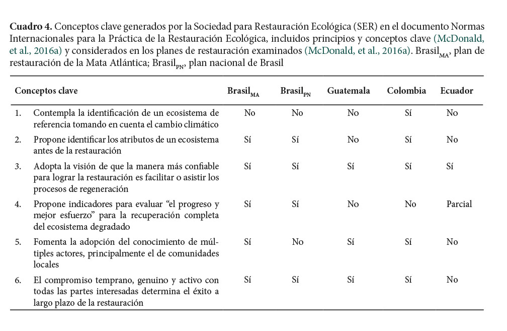 De los seis conceptos clave que establece la Sociedad para la Restauración Ecológica (SER) como principios fundamentales de la buena práctica de la restauración ecológica, el tercero, enlistado en el Cuadro 4 (adoptar los procesos de regeneración) fue incluido en todos los planes examinados. En la mayoría de los documentos analizados se consideró el concepto seis. Solo en tres planes se hace referencia a los conceptos dos y cinco, mientras que únicamente en dos planes se utilizó el concepto cuatro. Cabe destacar que el plan de Colombia fue el único que contempló la identificación del ecosistema de referencia (concepto uno; Cuadro 4).