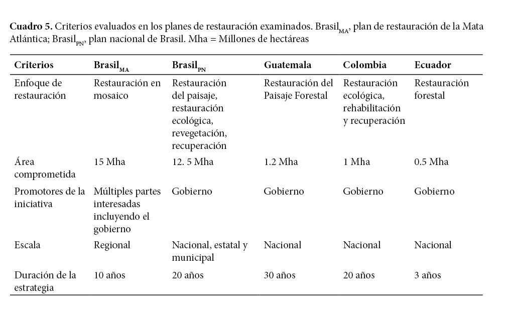 El área comprometida por los países en los planes evaluados varió entre 0,5 y 15 millones de hectáreas, la escala de la restauración frecuentemente fue nacional, con una duración de entre 3 y 30 años (Cuadro 5). La meta que se estableció para la Mata Atlántica de Brasil en el PACTO (2013a) fue la restauración de 15 millones de hectáreas para un periodo de 10 años, esto corresponde a 330 000 hectáreas por año. El plan nacional de Brasil estableció una meta para todo el país de 12,5 millones de hectáreas en 20 años que corresponde a la recuperación de 625 000 hectáreas de vegetación nativa por año. El gobierno de Guatemala espera que para 2045 (30 años del momento de su planteamiento) se hayan restaurado 1,2 millones de hectáreas, aproximadamente 40 000 hectáreas por año. El plan de Colombia estableció que para un periodo de 20 años se logrará la restauración de 1 millón de hectáreas, esto es, 50 000 hectáreas por año. Por último, el plan de Ecuador estableció que para 2017 (3 años) el gobierno lograría la restauración de 0,5 millones de hectáreas, esto corresponde aproximadamente a unas 60 000 hectáreas anualmente.