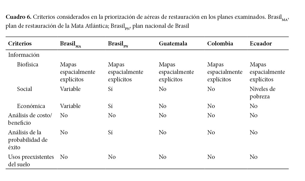 Los planes evaluados contemplaron la priorización de las áreas de restauración utilizando, principalmente, indicadores biológicos y físicos (Cuadro 6). Brasil consideró indicadores biofísicos y la participación de múltiples interesados en la priorización, pero de manera variable entre los planes municipales actualmente concretados. Las versiones de los planes de Guatemala y Colombia incluyeron mapas nacionales de priorización de áreas de restauración. En esos mapas se presentaron los niveles de degradación y representatividad ecosistémica. Ecuador incluyó en su priorización los niveles de pobreza como un indicador social de alto valor para la restauración. Cabe resaltar que ninguno de los planes evaluados incluyó análisis de costo-beneficio o un análisis explícito para evitar el uso de áreas productivas en la restauración (Cuadro 6).
