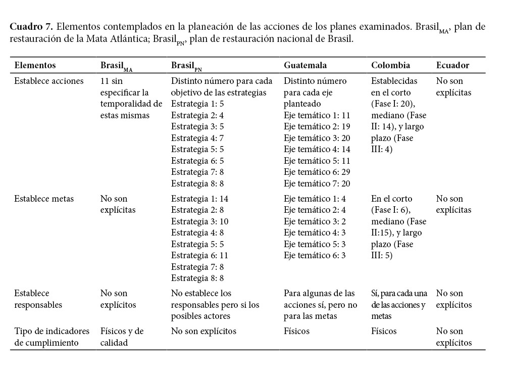 Entre dos y 15 metas fueron establecidas en los planes examinados. En el plan de la Mata Atlántica de Brasil y el de Ecuador, las metas no fueron establecidas de manera explícita. Las metas del plan nacional de Brasil estuvieron vinculadas a las acciones planteadas, estas oscilaron entre cinco y 14. En el plan de Guatemala se plantearon entre dos y cuatro metas por cada eje temático establecido. Las metas del plan de Colombia fueron pensadas para dar cumplimiento a las acciones planeadas, en este caso, se incluyeron 26 metas que se pretenden alcanzar en el corto, mediano y largo plazo (Cuadro 7).