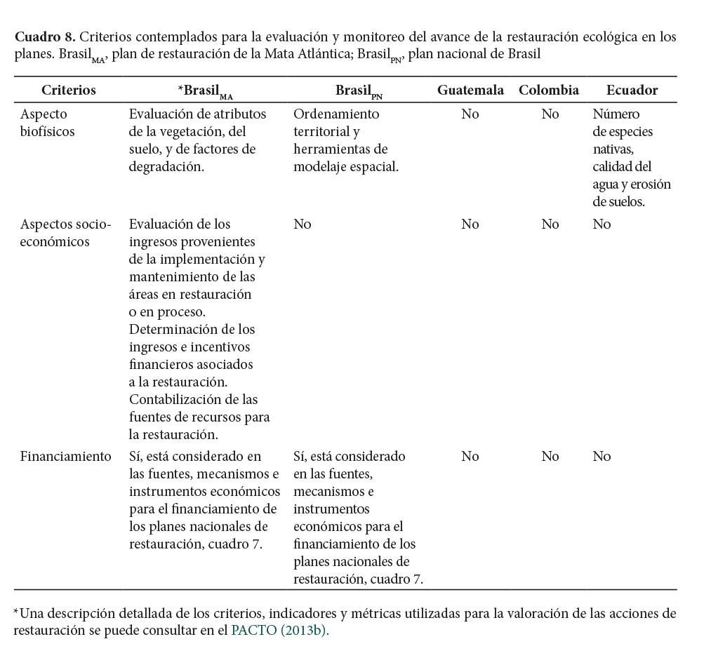 A la fecha, solo el plan de la Mata Atlántica de Brasil cuenta con un protocolo completo de monitoreo elaborado explícitamente para la valoración de las acciones de restauración. En dicho documento se establecen los criterios, indicadores y las métricas para monitorear tanto dimensiones ecológicas como socioeconómicas de la restauración (Cuadro 8). Por otro lado, el plan nacional de Brasil pretende utilizar herramientas de modelaje espacial para valorar el avance de las acciones de restauración. Guatemala se enfoca solo en el monitoreo o evaluación de la estrategia, sin mencionar cuales son los indicadores de éxito. El plan de Colombia no cuenta con un protocolo de monitoreo, pero el seguimiento de las acciones de restauración se pretende desarrollar e implementar mediante una estrategia nacional de monitoreo que aún está en proceso de elaboración. La efectividad de las acciones de reforestación del plan de Ecuador se evaluará con 11 indicadores ambientales y biofísicos, por ejemplo, número de especies nativas o calidad del agua y erosión de suelos.