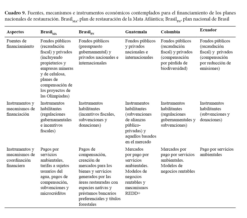 Los planes examinados contemplaron dos fuentes de financiamiento, cuatro instrumentos y mecanismos financieros y 10 instrumentos y mecanismos de coordinación financiera (Cuadro 9). Los recursos financieros para el progreso de los planes examinados se prevé emanen principalmente de la recaudación fiscal y de compensaciones por pérdida de biodiversidad. Las regulaciones gubernamentales como las normas y leyes, los incentivos fiscales como impuestos, permisos y subsidios, o las subvenciones de donantes o de gobierno, son algunos instrumentos y mecanismos financieros contemplados en las iniciativas. Los esquemas de pago por servicios ambientales son el instrumento financiero de coordinación principal de los planes. Las tarifas a los usuarios del agua, pagos de compensación, subvenciones, microcréditos, créditos preferenciales y los títulos forestales son opciones financieras adicionales adoptadas para la restauración en Brasil. Los planes de Guatemala y Colombia contemplan, además, la generación de modelos de negocios rentables. Un mecanismo adicional incorporado en el plan de Guatemala es el pago por la REDD+.