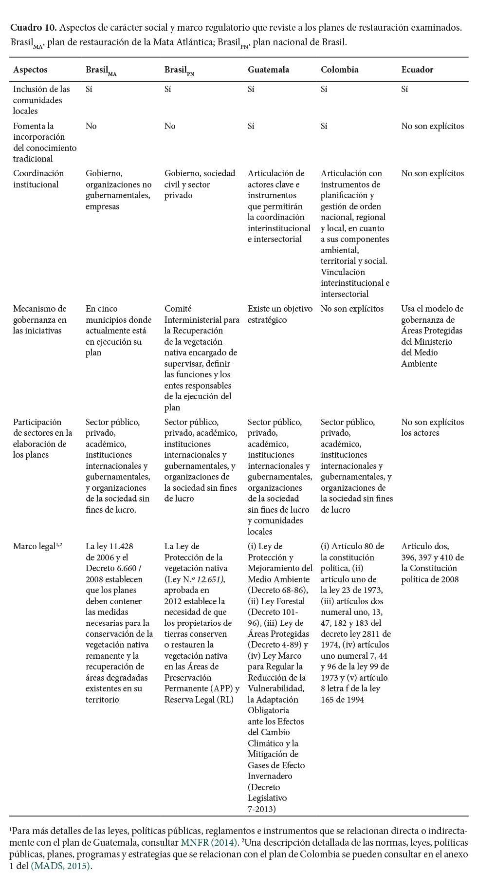 Respecto al marco legal que reviste a los planes, el análisis mostró que las iniciativas están estrechamente ligadas al marco regulatorio existente en cada país (Cuadro 10). La revisión del PACTO indicó que la restauración de los ecosistemas de la Mata Atlántica en Brasil son regulados por una ley que fue decretada en 2006. El plan nacional de Brasil surge para dar cumplimiento a las disposiciones de la Ley 12.651 del 2012. Al examinar el plan de Guatemala se encontró que el marco regulatorio de las acciones previstas en el plan incluye cuatro leyes, cinco políticas públicas, dos reglamentos y siete instrumentos. El plan de Colombia se relaciona con 15 leyes, ocho normas, siete políticas públicas, seis planes, tres programas y dos estrategias. Por otro lado el plan de Ecuador está revestido por: (i) los principios y derechos de la constitución política de 2008 de ese país, especialmente en el derecho de las personas a vivir en un ambiente sano y equilibrado y (ii) en el derecho de la naturaleza a la restauración. En síntesis, los planes están pensados para fortalecer y guiar las políticas públicas de cada país y para vincular los marcos regulatorios legales existentes con la práctica de la restauración.
