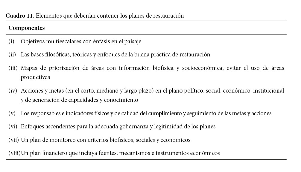 Finalmente, los planes de restauración futuros deberían contener: (i) objetivos multiescalares con énfasis en la escala del paisaje para la recuperación de servicios ecosistémicos, (ii) las bases filosóficas, teóricas y enfoques de restauración actuales de la buena práctica de la disciplina (e.g., McDonald, et al., 2016a), (iii) mapas espacialmente explícitos, de gran resolución y a múltiples escalas que utilicen información biofísica, socioeconómica y del éxito de la restauración para la selección y priorización de áreas; en la priorización se deberían evitar áreas productivas, (iv) acciones y metas, concretas y viables en el plano político, social, económico, institucional y de generación de capacidades y conocimiento que sean establecidas en el corto, mediano y largo plazo, (v) los responsables e indicadores físicos y de calidad del cumplimiento y seguimiento de las metas y acciones, (vi) enfoques ascendentes para la adecuada gobernanza de las acciones de restauración y legitimidad de los planes, (vii) un plan de monitoreo con criterios biofísicos, sociales y económicos que contemple la generación de infraestructura unificada y compartida para evaluar el éxito de las acciones de la restauración en el espacio y tiempo, y (viii) un plan financiero que incluya las fuentes, mecanismos e instrumentos económicos contemplados para el financiamiento de los planes nacionales de restauración (Cuadro 11).