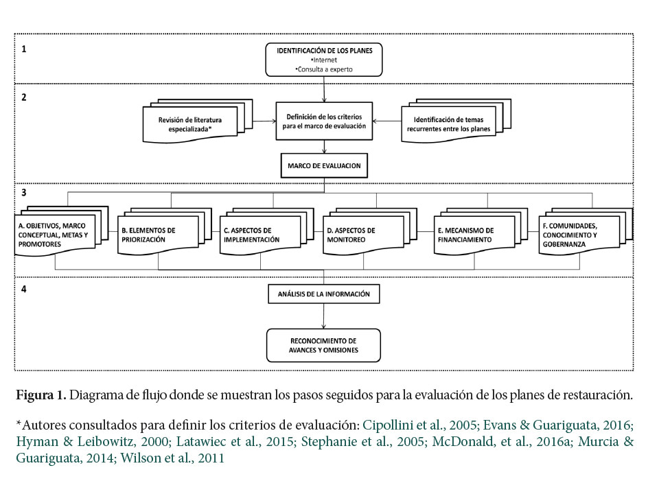 Para identificar los planes de restauración actuales en Latinoamérica se utilizó el motor de búsqueda en internet de Google y se consultaron personas expertas en el tema (Figura 1, caja uno). Las palabras que se usaron en la búsqueda fueron “plan nacional”, “estrategia nacional”, restaur*, recuperar*, “plano nacional”, “restauração” o “recuperação”. Una vez reconocidos los documentos se eligieron (i) los más recientes, (ii) de escala nacional, (iii) que incluyeran la recuperación de grandes extensiones de tierras degradadas o deforestadas y (iv) de países comprometidos con la restauración de sus ecosistemas ante las iniciativas Aichi del CDB, el Reto de Bonn o la Iniciativa 20x20.