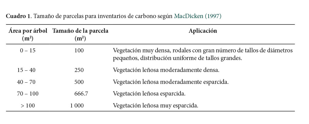 El diseño de muestreo, la intensidad o tamaño la muestra, y el tamaño de las parcelas está en función de los objetivos, de la precisión requerida y de los recursos disponibles, además de la cantidad carbono almacenado. Para definir el tamaño de la parcela también debe considerarse la densidad arbórea. Al respecto, MacDicken (1997) da algunas recomendaciones (Cuadro 1).