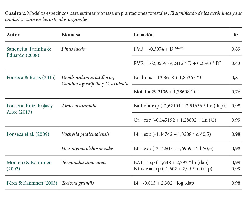 b. Aplicación de una ecuación de regresión genérica al diámetro o a otras medidas de los árboles (Cuadro 2). Existen modelos generales para estimar el contenido de biomasa aérea en inventarios forestales (Brown et al., 1989, Schroeder et al., 1997), su uso se justifica cuando no existen modelos específicos para zonas o condiciones particulares o cuando varias especies presentan un patrón morfológico de crecimiento similar (Acosta et al., 2002).