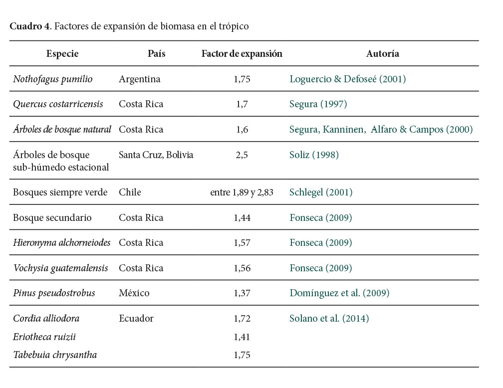 En Costa Rica, para determinar el carbono almacenado y para hacer proyecciones, investigaciones de la FAO (2003) utilizaron los siguientes factores de expansión:
