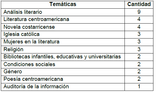 En esta escuela se han presentado 65 TFG en la carrera de Licenciatura en Bibliotecología y Documentación, algunos de los cuales están disponibles en formato digital en la página de la Escuela. El primer TFG se presentó en 1994 y cuatro años después el segundo. Los temas más estudiados son los relacionados con las bibliotecas, su creación y gestión; luego, se ha trabajado mucho el tema control bibliográfico y documental (mapeando los siguientes lugares de Costa Rica: Puriscal, San Joaquín, San Rafael, Golfo de Nicoya, Heredia Centro, San Ramón, Cartago y Barva). Otro tema muy estudiado es la evaluación, tanto de servicios, de colecciones como de la propia Escuela de Bibliotecología, que ha sido objeto de estudio para analizar su historia y para auditar la calidad de la educación ofrecida al estudiantado. En el Cuadro 5 se presentan los temas estudiados.
