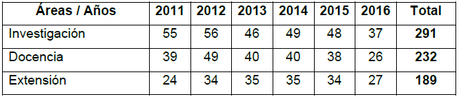 Teniendo en cuenta este marco, los proyectos que se pudieron identificar fueron 1351, pero se determinó que 467 son continuación o etapas de proyectos que supuestamente ya se habían concluido y que en algunas ocasiones se convertían en cátedras permanentes, otros son actividades puntuales dirigidas a la gestión administrativa de la unidad académica (procesos de autoevaluación y acreditación de carreras), a la organización de eventos y los hay también para la gestión de las publicaciones periódicas de cada unidad, como se muestra a continuación: