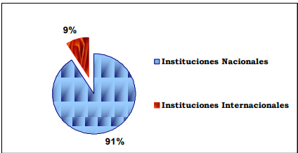 En general, las instituciones a las que están adscritos los(as) autores(as) que publicaron en este periodo pueden ser divididas en nacionales e internacionales, sin tomar en cuenta aquellos cuya afiliación no fue posible determinar. El resultado de esta separación es claramente apreciado en el siguiente gráfico.