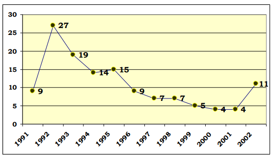 En este gráfico queda plenamente demostrado el continuo descenso de la publicación entre los años 1993-2001 y como en el 2002 a pesar del incremento en la producción, se suspende nuevamente la publicación hasta el día de hoy.