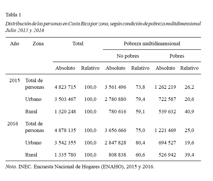 Instituto Nacional de Estadística y Censos. (2016). ENAHO. 2016. Indicadores de pobreza multidimensional según zona y región de planificación, julio 2016. Instituto Nacional de Estadística y Censos. C.R. Recuperado de http://inec.cr/encuestas/encuesta-nacional-de-hogares.