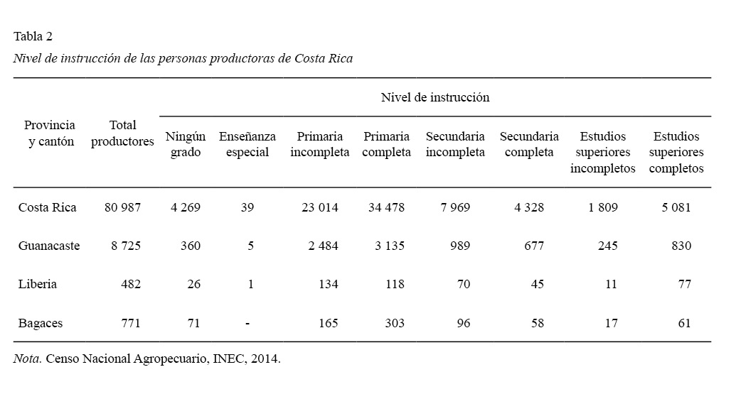 Adicionalmente, estos agricultores tienen bajos niveles de escolaridad, en donde el 86,18 % no ha completado la secundaria (el 5,3 % no lee ni escribe; el 28,4 % tiene primaria incompleta; el 42,6 % primaria completa, y el 9,8 % secundaria incompleta), según se desprende del último Censo Nacional Agropecuario, realizado en el 2014, tal y como se muestra en la tabla 2. Con respecto a los datos recuperados de los cantones Liberia y Bagaces, en comparación con los totales de Guanacaste y Costa Rica.