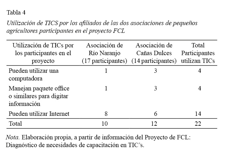 Como se puede deducir de la tabla 4, el 81,10 % de los participantes no tenía competencias para la mecanografía y procesamiento de información por medio de dispositivos tecnológicos, competencia necesaria para cumplir con el requisito básico de redactar un perfil de proyecto, para solicitar financiamiento o apoyo a una institución.