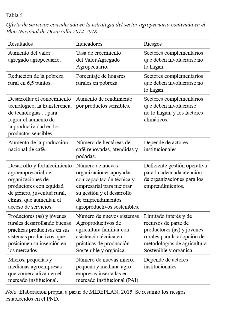 El PND, como instrumento de planificación, no incluye metas e indicadores relacionados con el desarrollo de las capacidades requeridas por las organizaciones de productores agrícolas pequeños, como en los casos estudiados, a pesar de que en el diagnóstico se identifica la existencia de estas necesidades, las cuales deben subsanarse, si se quiere aumentar la competitividad, sostenibilidad, potencializar los territorios, la equidad, e inclusión social, tal y como indica el PESA 2010-2021.