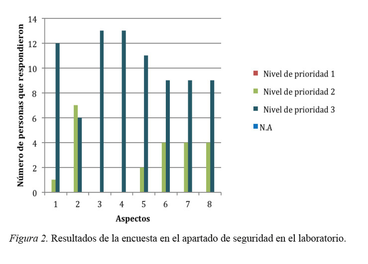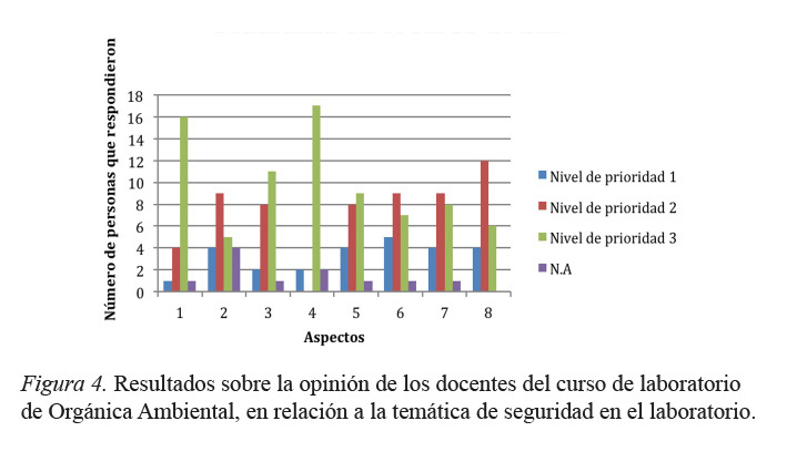 Los resultados de la encuesta aplicada a los profesores de dos de los cursos de laboratorio de la Cátedra de Química Orgánica, a saber: Laboratorio de Biorgánica y Laboratorio de Química Orgánica Ambiental, en relación con seguridad en el laboratorio, los profesores que imparten los cursos de laboratorio de Biorgánica consideran que los aspectos que requieren mayor atención son: la normativa sobre seguridad en el trabajo de laboratorio, no se encuentra colocada en un lugar visible, por tanto no es conocida y analizada por los estudiantes. Otro aspecto que se considera de atención inmediata es el contar con las hojas de seguridad para las sustancias utilizadas en las prácticas de laboratorio y a su poca accesibilidad. Además, se hizo referencia a la necesidad de utilizar una etiqueta estandarizada para el manejo de reactivos y residuos químicos, que contenga la información de seguridad apropiada. Se evidenció la necesidad de dar mayor difusión a nivel de estudiantes y profesores de los protocolos para la atención de emergencias como derrames, incendios, temblores u otros. Las observaciones anteriormente indicadas se pueden apreciar en la figura 2.