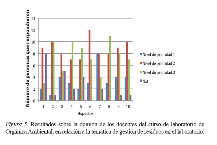 En relación con la gestión de residuos químicos, los profesores que imparten el laboratorio de Orgánica Ambiental, consideran que se debe establecer un proceso para la gestión y el tratamiento de los residuos. La figura 5 evidencia el aspecto antes señalado.