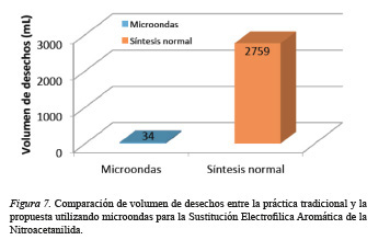 La síntesis de microondas validada, se puso a prueba con un grupo piloto de laboratorio, para compararla con la síntesis tradicional. La relación en la reducción de desechos se muestra en el figura 7. Aquí se compara, por medio de barras, el volumen de desechos líquidos generados en la práctica verde propuesta y la tradicional. Dicha gráfica señala una disminución significativa, que corresponde a un 98,8 % en mililitros, demostrando otra de las ventajas que presenta esta síntesis y el cumplimiento del principio de la Química Verde de evitar o reducir la producción de residuos.