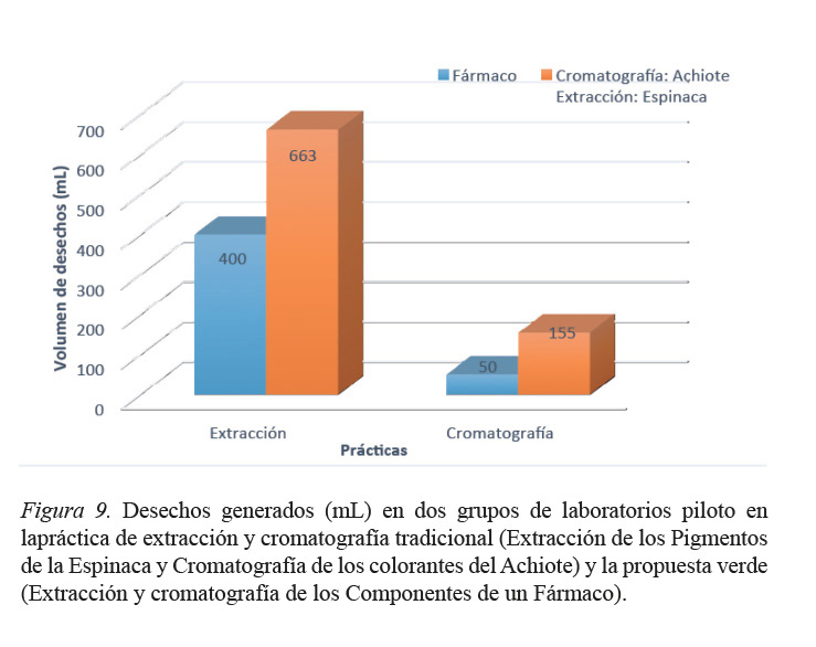 En el figura 9 se muestra la comparación de las prácticas convencionales y la propuesta, en términos de generación de desechos líquidos. Tanto en la etapa de extracción como en la de cromatografía, se observa una reducción de desechos de un 60% y de un 32%, respectivamente. Este resultado indica el cumplimiento de dos de los principios de la Química Verde: la disminución de los desechos generados y la sustitución de disolventes contaminantes por disolventes acuosos. (Anastas, P; Eghbali, N. 2010)