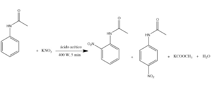 En la práctica se utilizan como agentes nitrantes el nitrato de potasio y el nitrato de cobre II, los subproductos generados fueron el acetato de cobre y el acetate de potasio; y la mezcla de productos de orto- y para- nitroacetanilida (ver reacciones 1 y 2). Por extracción con acetato de etilo y concentración de la fase orgánica en un rotavapor, se obtuvo un sólido de color amarillo pálido que corresponde a la mezcla de orto- y para- nitroacetanilida.