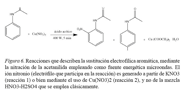 Las Prácticas: Sustitución Electrofilica Aromática: Nitración de la Acetanilida con microondas, Sustitución Electrofilica Aromática, utilizada en los laboratorios de Química Orgánica II y Biorgánica, se clasificaron como críticas según la Matriz de Evaluación de Riesgo. Esta síntesis produce 60,6 g de orto y paranitroacetanilida, del cual se utiliza solamente 2,0 g para realizar su recristalización con etanol y el punto de fusión de la para-nitroacetanilida aislada, por lo que se desecha el 96,7 % del producto sintetizado (mezcla de orto- y para- nitroacetanilida), generando una mayor cantidad de residuos químicos que posteriormente deben disponerse de forma especial, implicando un costo adicional por parte de la Escuela de Química y un uso desproporcionado de reactivos. La síntesis tradicional, requiere de una mezcla de ácido nítrico y de ácido sulfúrico que es muy corrosiva, implicando un riesgo potencial a la salud de los estudiantes que realizan la práctica. La mezcla ácida es adicionada utilizando un embudo de extracción al recipiente de reacción, por lo que los estudiantes durante toda la síntesis se exponen a los vapores generados. Por las desventajas mencionadas, se sustituyó la síntesis de nitración de la acetanilida por una síntesis verde, utilizando energía de microondas. El uso de microondas es uno de los métodos más convencionales que se han desarrollado en la síntesis orgánica, con el fin de que sean amigables con el ambiente y el ser humano (Yadav, U et al, 2012; Miranda, 2010). Esta síntesis mostró resultados reproducibles en un horno de microondas fijado en 400 W durante 5 minutos.