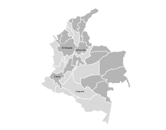 Mapa de Colombia, Departamentos de Antioquia, Santander, Cauca y Caquetá.