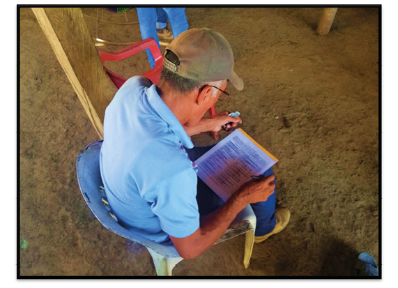 Productor de cacao diligenciando la encuesta física.