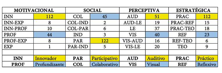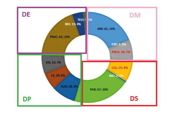 A continuación, se describen los resultados obtenidos del diagnóstico realizado en las cuatro dimensiones: En la Dimensión Estratégica (DE) podemos encontrar el grupo productorPráctico (PRAC), Reflexivo (REF) y Teórico (TEO). En la Dimensión Motivacional (MV) podemos encontrar presonas productoras Innovadoras (INN), Expectantes (EXP) y Profundizantes (PROF). En la Dimensión Social (DS) podemos encontrar personas productoras Colaborativas (COL), Individuales (IND) y Participativas (PAR). Y en la Dimensión Perceptiva (DP) podemos encontrar personas productoras Visuales (VIS), Lecto-Esctritoras (LE) y Auditivas (AUD).