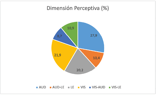 Para la dimensión perceptiva (Figura 23), podemos observar como en los otros análisis que los productores y las productoras caracterizadas tuvieron preferencias diversas, lo que demuestra que podemos aplicar herramientas tanto auditivas, visuales como lecto-escritoras.