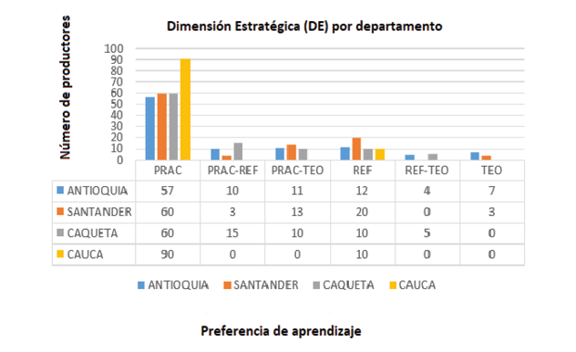Para la dimensión estratégica por departamento (Figura 24), podemos observar que todas las regiones se inclinaron por contar con productores y productoras con preferencias de aprendizaje prácticos, lo que demuestra que con este grupo de población podemos incursionar en un 100% con herramientas de aprender haciendo directamente en campo y demostraciones de métodos.