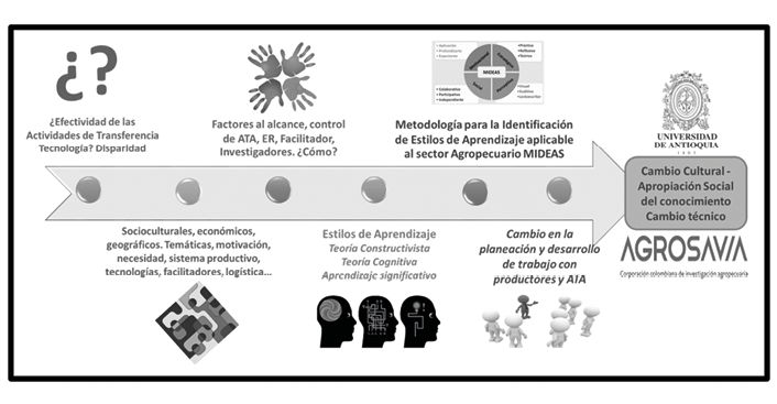 La Mideas es el resultado de un proceso investigativo cuyos resultados fueron validados con personas agricultoras, técnicas, y académicas en diversos sistemas productivos agrícolas y pecuarios en diferentes zonas agroecológicas de Colombia. Como resultado del proceso investigativo desarrollado por la Universidad de Antioquia y la Corporación colombiana de investigación agropecuaria durante los años 2016 y 2017, donde se creó Mideas, buscando que sus procesos de transferencia de tecnología fueran más eficientes en cuanto a adopción, apropiación o adaptación (Figura 1). Esta metodología propone cuatro fundamentos o dimensiones que debe tener la herramienta para la identificación de estilos de aprendizaje de las personas actoras del sector agropecuario: 1) Dimensión motivacional: aquí se analizan las motivaciones y actitudes frente al aprendizaje con las que llega la persona productora o técnica a una capacitación; 2) Dimensión perceptiva: aquí se analizan las preferencias por acceso y selección de información; 3) Dimensión estratégica: aquí se analiza cómo la persona productora o técnica actúa en el proceso de aprender y su preferencia por el procesamiento e integración de la información; 4) Dimensión socio-afectiva: aquí se analizan las preferencias por las relaciones interpersonales y el tamaño del grupo de interacción en el proceso de aprendizaje.