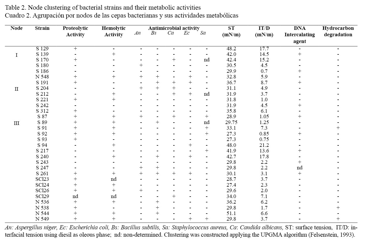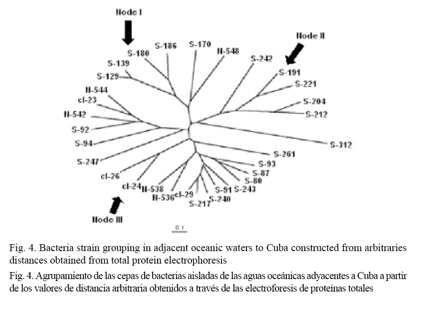 Bacillus species found in the oceanic waters differ from those previously reported in waters and sediments of several zones of the Cuban insular shelf (Miravet et al. 1983; Lugioyo et al. 1987; Lugioyo and Rodríguez, 1988; Coya, 1999; Miravet et al. 1992; Miravet et al. 2001; Miravet et al. 2003) fact that could be associated with the adaptive capacity of these species to propagate and metabolize under oligotrophic marine conditions (Oguntoyinbo, 2007). In fact, the phylogenetic clustering built from total protein data of spore-forming Gram positive bacteria resulted in three nodes in which bacteria do not associate according to species, since it was found out that more than one species was represented in different nodes. In fact, there is an apparent relationship between the environmental conditions from where bacteria and the results of clustering were isolated. In a similar way, Zuriaga et al. 2009, examining the genetic and bioclimatic variation in Solanum pimpinellifolium found out that the locality with the greatest climatic diversity, also exhibited the highest genetic diversity. In our work, those strains found in node I were isolated, generally, from the farthest zones of the coast, more impoverished in nutrients and organic matter while nodes II and III group those strains coming from zones with higher exchange with shelf waters and where dynamics of water masses promote arrival and stay of nutrients. This might suggest that the existence of different total protein patterns in bacteria belonging to the same species, but from environments with different degree of richness, could be an indicator of the capacities of these microorganisms to adapt and live in different environments. Another argument in this same direction is that the bacterial strains of these nodes also showed the highest values of the ratio positive enzymatic activity per isolate, which in turn may represent another indicator of their adaptive potentiality.
