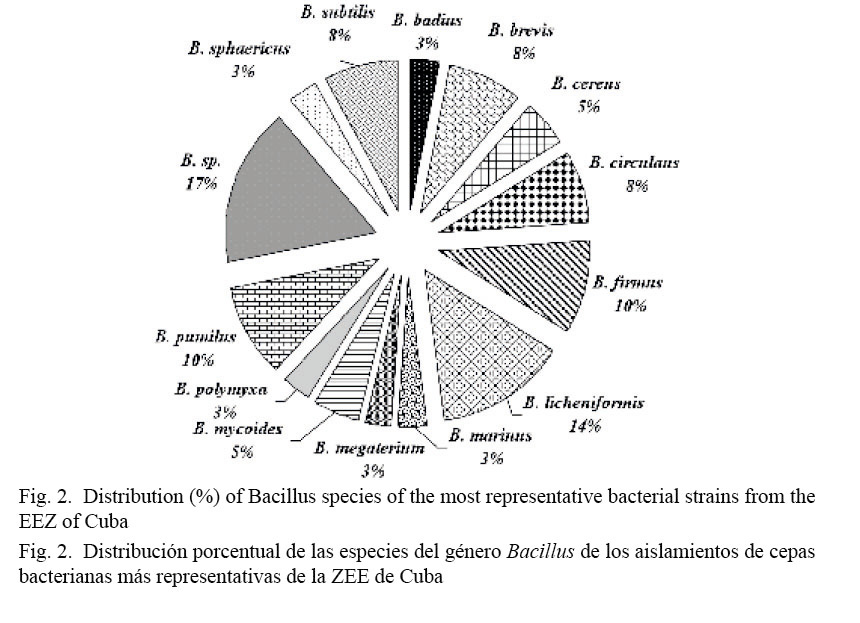 The species Bacillus cereus, B. circulans, B. firmus, B. mycoides, B. pumilus are described for the first time in the EEZ waters and so far have not been reported for waters of the insular shelf (Miravet & Lugioyo, 2007).