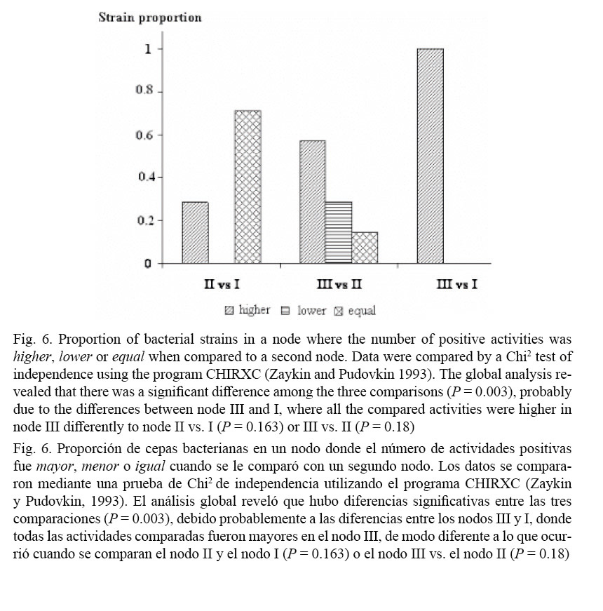 Considering all the isolates, the proportion of strains exhibiting positive biological activities were classified in three qualitative categories: higher, equal or lower resulting from comparing nodes II vs. I, III vs. II and III vs. I using a Chi2 test of independence through the program CHIRXC (Zaykin & Pudovkin, 1993).