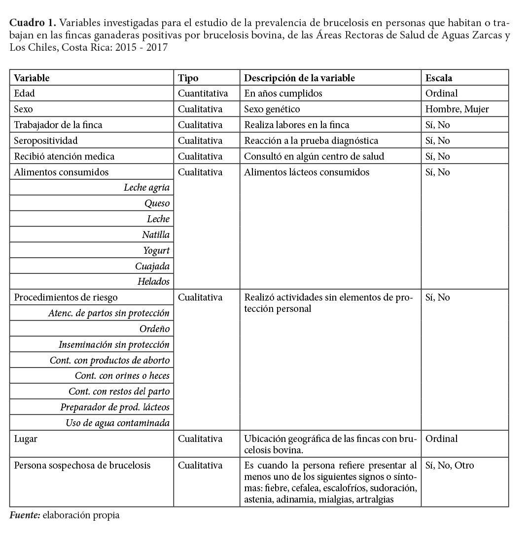 En las Áreas Rectoras de Salud de Aguas Zarcas y Los Chiles, se realiza un estudio transversal, de prevalencia y analítico. Se incluye a las personas que habitaban o trabajaban en las fincas ganaderas con reactores positivos a brucelosis bovina en los tres años (2015 al 2017) previos al período de estudio. Se excluye a las personas que no son habitantes o trabajadores permanentes de la finca, o cuya relación con la finca no fuera constante; por ejemplo, trabajadores ocasionales o personas que llegan de visita en forma temporal. Igualmente, se excluye, a quienes se regala o vende productos lácteos, quienes no pertenecen al grupo familiar que habita la vivienda. Asimismo, se deja por fuera a trabajadores que ingresan a la finca posterior a la fecha en que el SENASA declara libre de brucelosis esa finca ganadera. Finalmente, no se toma en cuenta a las personas con menos de dos meses de vivir o trabajar en la finca.