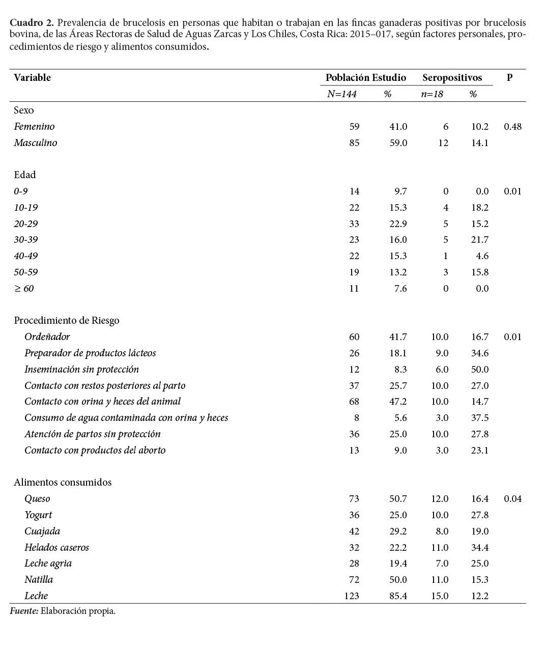 Se investiga un total de 144 personas, a las cuales se toma la respectiva muestra sanguínea, en ambas Áreas Rectoras: Los Chiles y Aguas Zarcas. El 12.5% (n=10) de las personas resultan positivo a Brucella spp. Mayor la seroprevalencia en hombres, (14.1%), que en mujeres (10.2%), aunque no es significativa (Cuadro 2).