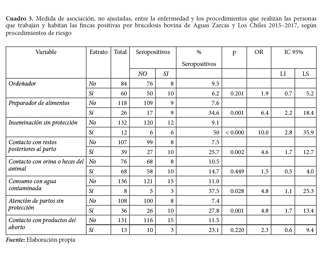 Al análisis (bivariado), sin ajustar las variables de procedimientos de riesgo realizados por las personas estudiadas, quien es ordeñador o tiene contacto con el aborto o sus productos, resulta no estar asociado con la condición de seropositivo a Brucella spp. Las variables con el riesgo son: la inseminación artificial, sin protección adecuada, y la preparación de productos lácteos, como queso, seguido del contacto con restos del parto, la atención de partos y el consumo de agua contaminada (Cuadro 3).