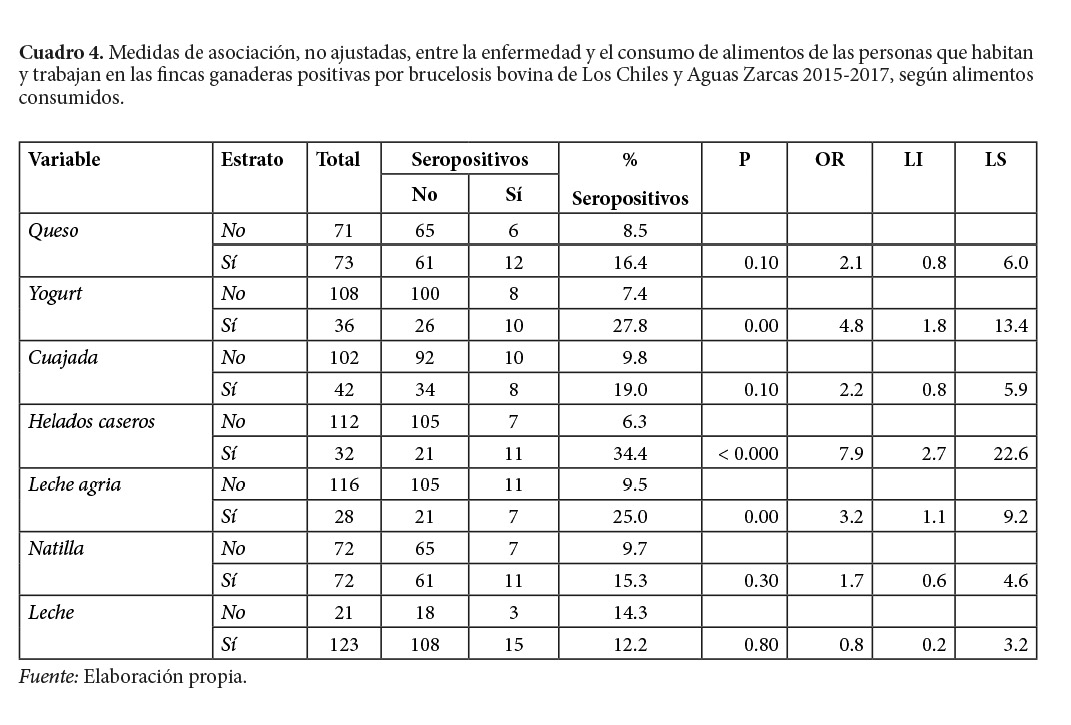 Por otra parte, respecto al consumo de productos lácteos, únicamente el consumo de helados caseros, yogurt y leche agria sin pasteurizar, son asociados con la seropositividad a la bacteria, en el análisis no ajustado (Cuadro 4).