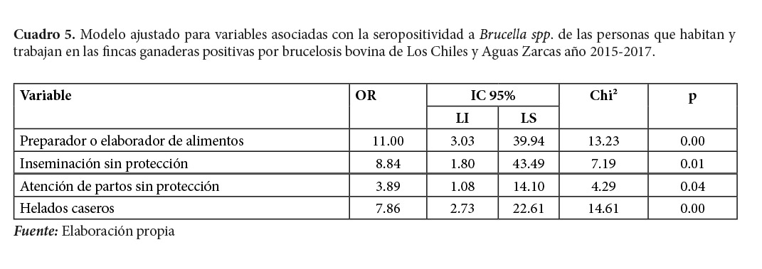 De las cinco variables con asociación estadísticamente significativa, en el análisis bivariado, para prácticas de riesgo (Cuadro 3), así como las de consumo de alimentos lácteos (Cuadro 4), resulta explicativas, una vez ajustadas en el modelo multivariado el hecho de elaborar alimentos con: productos lácteos tales como quesos no pasteurizados, la inseminación artificial sin protección adecuada y la atención de partos sin indumentaria básica de protección; asimismo, de los alimentos de riesgo, únicamente el consumo de helados caseros representa riesgo (Cuadro 5).