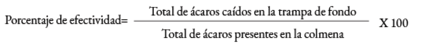 Para determinar la efectividad de la trampa de fondo, se cuantificó la caída natural de varroa durante los primeros 30 días; posteriormente la mortalidad de ácaros con el Bayvarol® durante seis semanas, considerando que ambos conteos representan el total de ácaros presentes en la colmena.