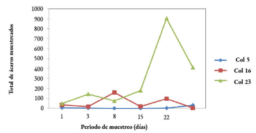 Durante las primeras 24 horas de evaluación, el promedio de ácaros en las colmenas fue de 30 ± 13. La colmena número 5 presentó una colecta más homogénea de varroa respecto a las otras colmenas, con un promedio de 12 ácaros por semana. Por otra parte, la colmena número 16 mostró caídas evidentes en los días 8 y 22, con 160 y 98 ácaros, respectivamente. Mientras que la colmena 23 presentó los niveles más elevados de caída natural de varroa, siendo superiores a los 75 ácaros por semana, hasta alcanzar 903 individuos el día 22 del estudio (Figura 1).