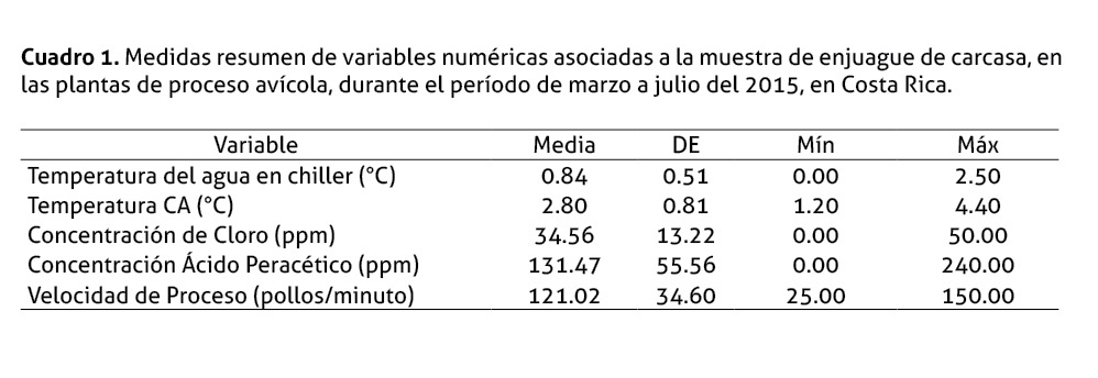 Las variables continuas fueron analizadas mediante estadística descriptiva (Cuadro 1); las variables reglamentadas, como temperatura de la carcasa a la salida del chiller (≤4.4°C) y la concentración del cloro en el agua de la carcasa (20-50 ppm), se encontró según el reglamento (SENASA 2013); excepto en una visita en la cual la concentración de cloro estuvo en 0.00 ppm.