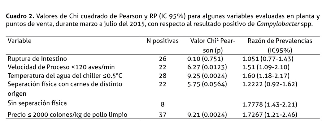 No se halló valores cercanos a la significancia para ruptura de intestino, temperatura de CA, concentración de cloro, concentración de ácido peracético; pero sí se encontró asociación estadística en el caso de velocidad de proceso <120 aves/min, así como para temperatura del agua del chiller ≤0.5°C (Cuadro 2).
